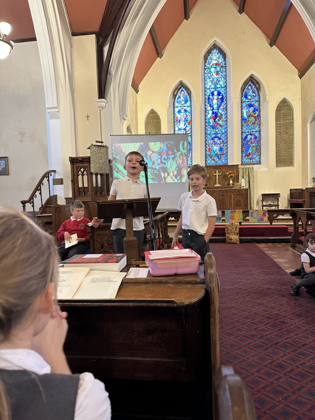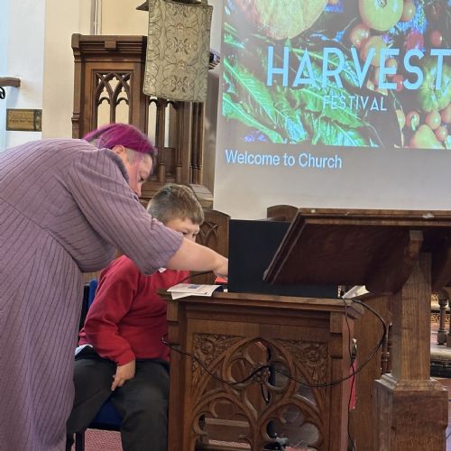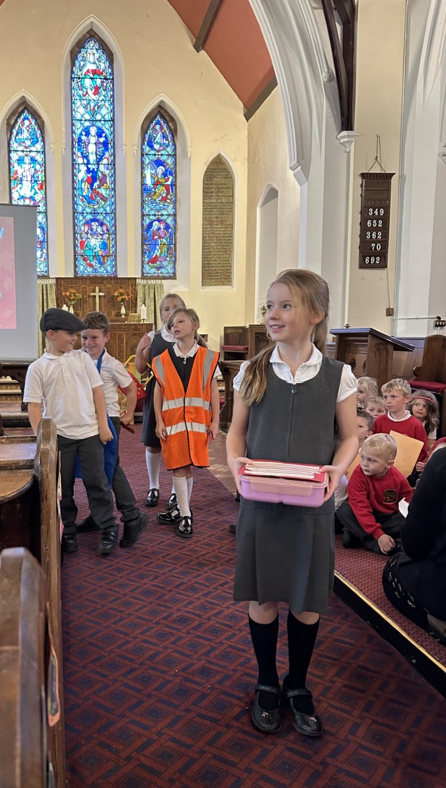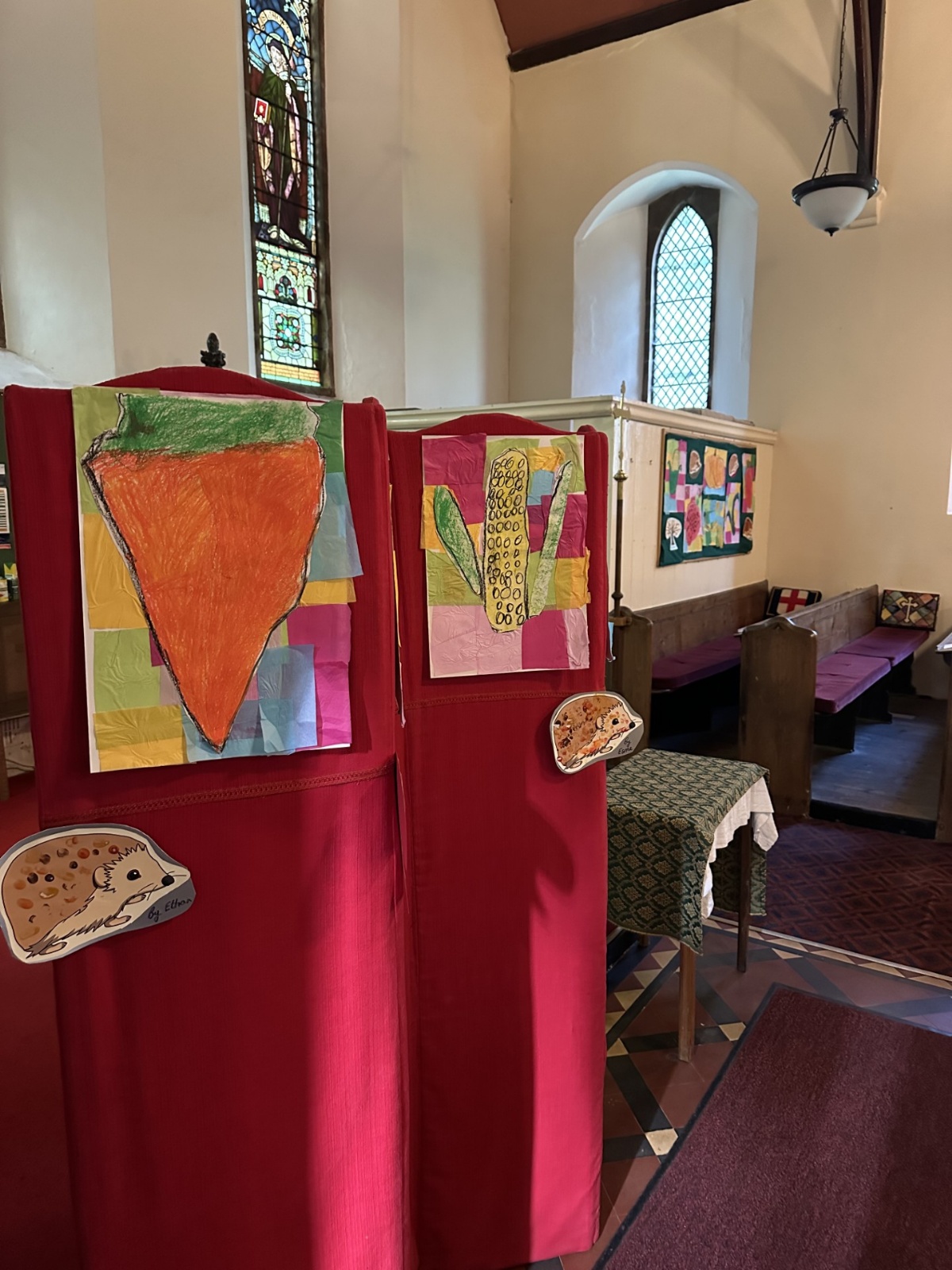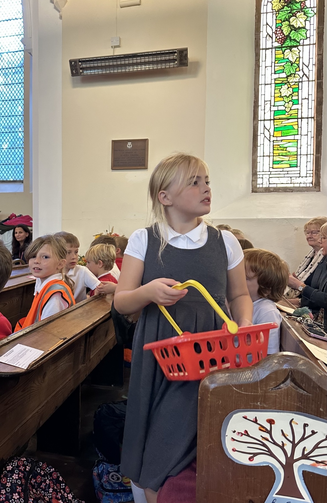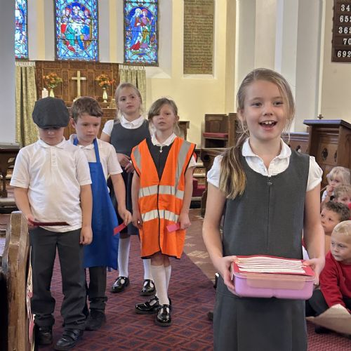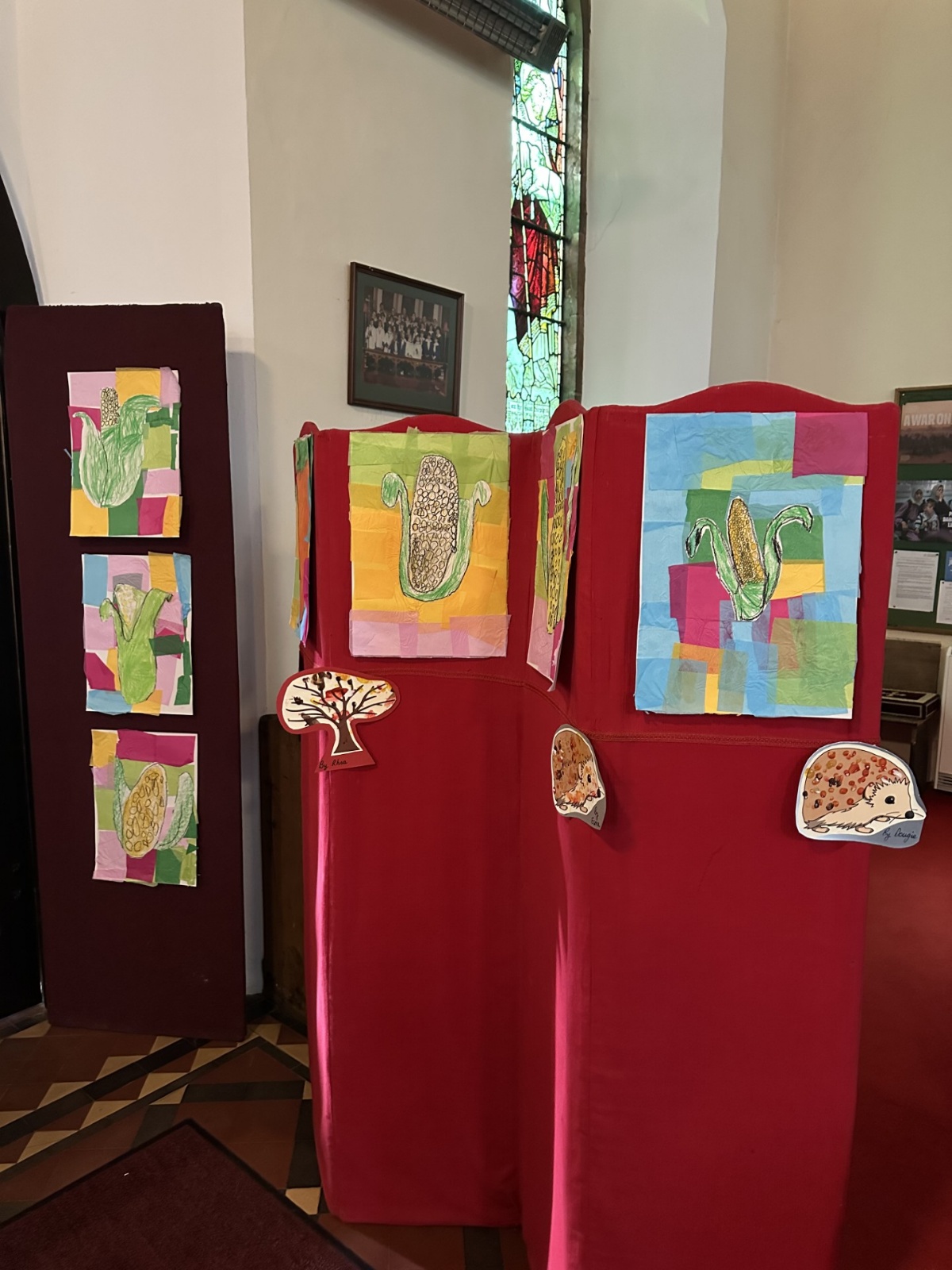 On a very sunny Monday afternoon, St John's First School walked down to church to celebrate the harvest festival. There the children sang hymns, said Thank you to God for all the food, read a bible story and decorated the church with their beautiful artwork. Cathy and Rev Simon helped the children during the service. It was lovely to see so many families join in with our celebrations.
