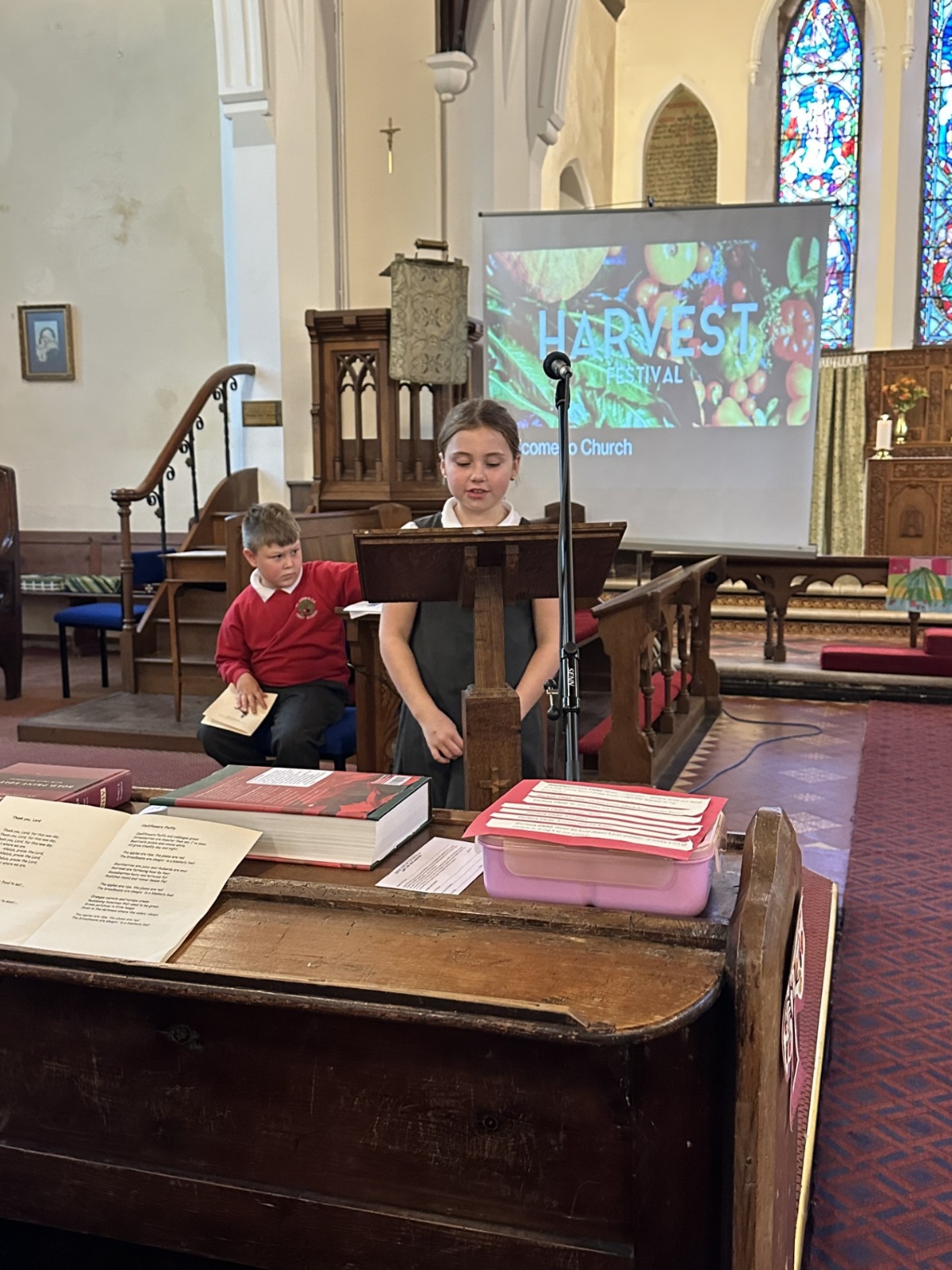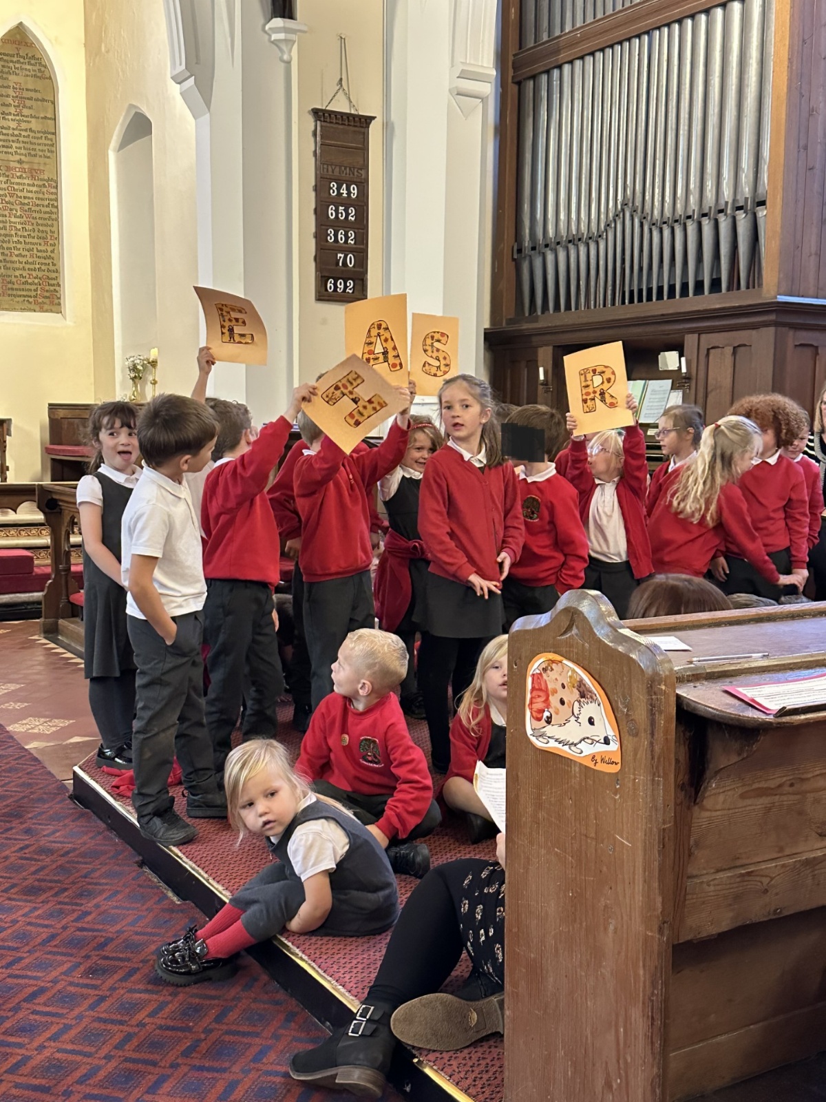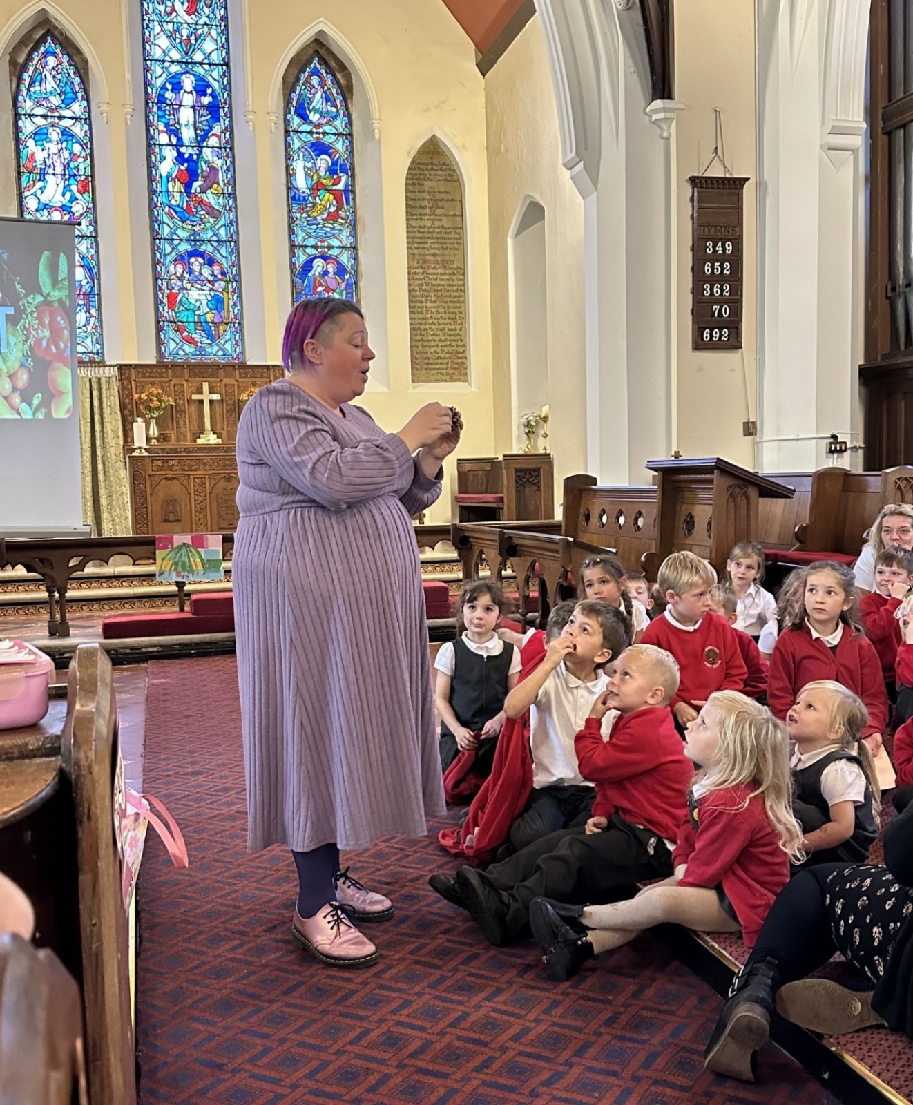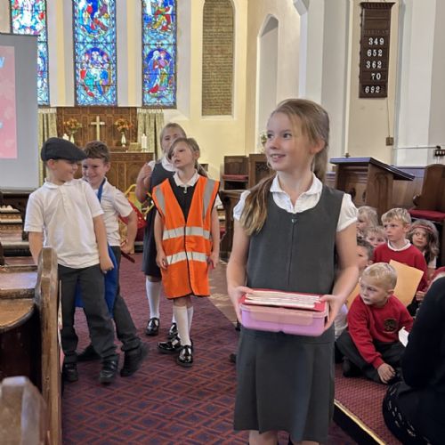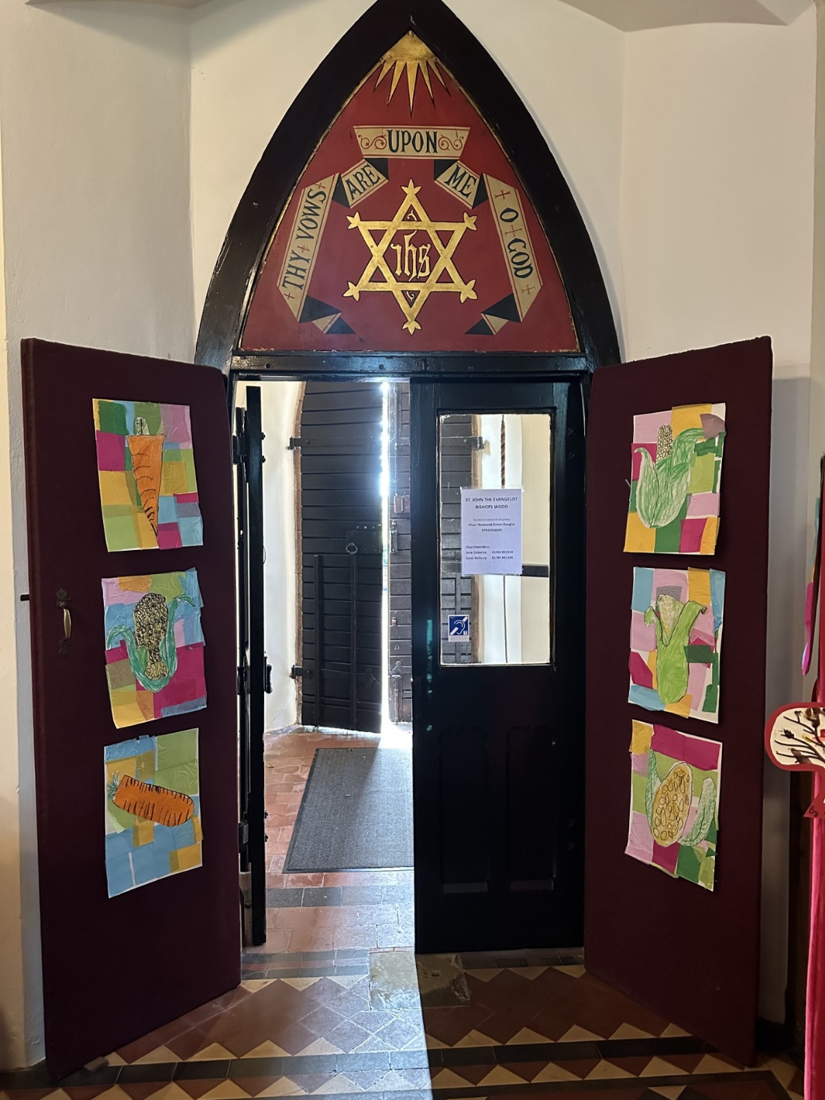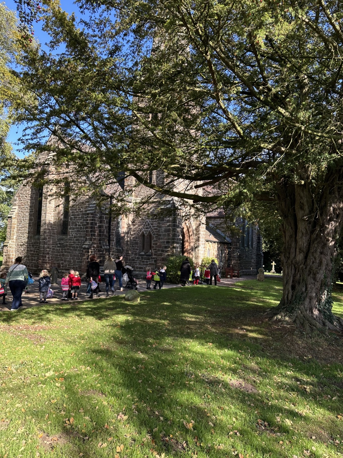 On a very sunny Monday afternoon, St John's First School walked down to church to celebrate the harvest festival. There the children sang hymns, said Thank you to God for all the food, read a bible story and decorated the church with their beautiful artwork. Cathy and Rev Simon helped the children during the service. It was lovely to see so many families join in with our celebrations.